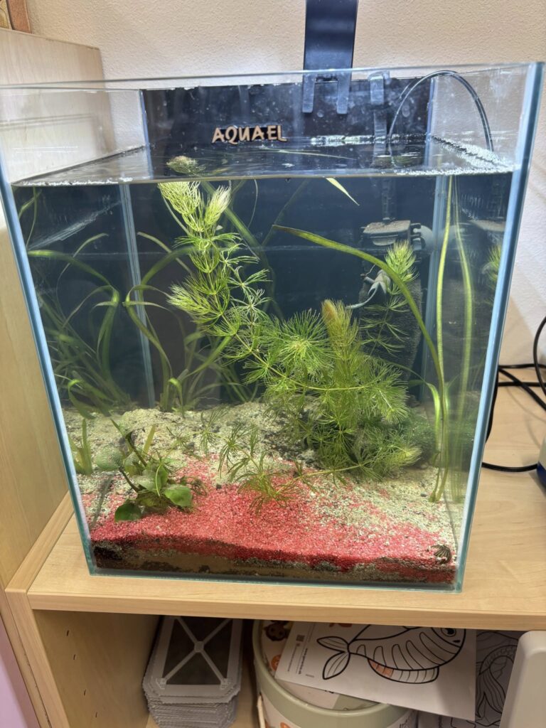 Zatiaľ sa rastlinky v akváriu krásne zakoreňujú a keď sa voda vyčistí, pribudne k nim aj prvý obyvateľ – slimáčik. Už sa všetci tešíme, ako budeme spoločne pozorovať, čo sa v našom akváriu bude diať.